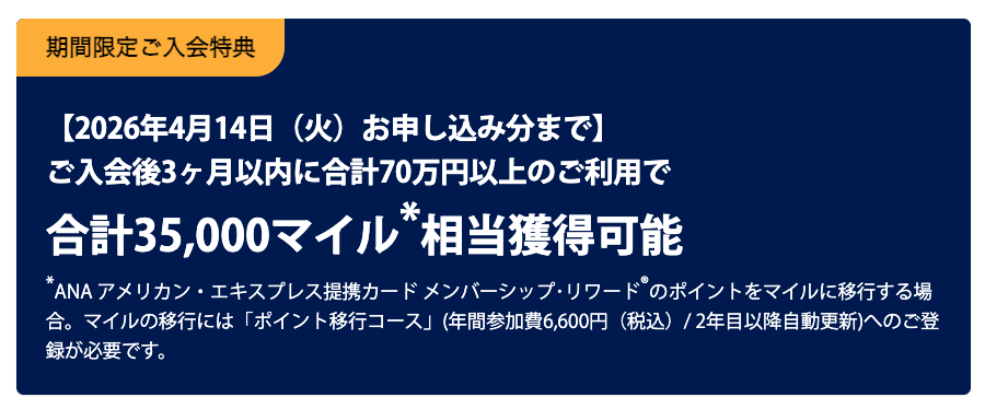 - 期間内に70万円の利用で、最大35,000マイル相当のポイントを獲得することができます。
