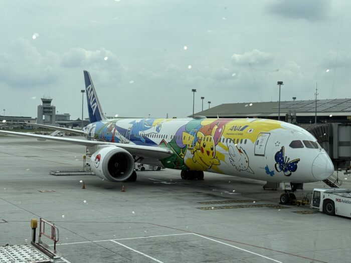 ポケモンとのコラボジェットは、B787-9のピカチュウジェットとB777-300ERのイーブイジェットの2機だけとなっていて、いつどこの路線で運行しているかは割と直前にならないとスケジュールがわかりません。