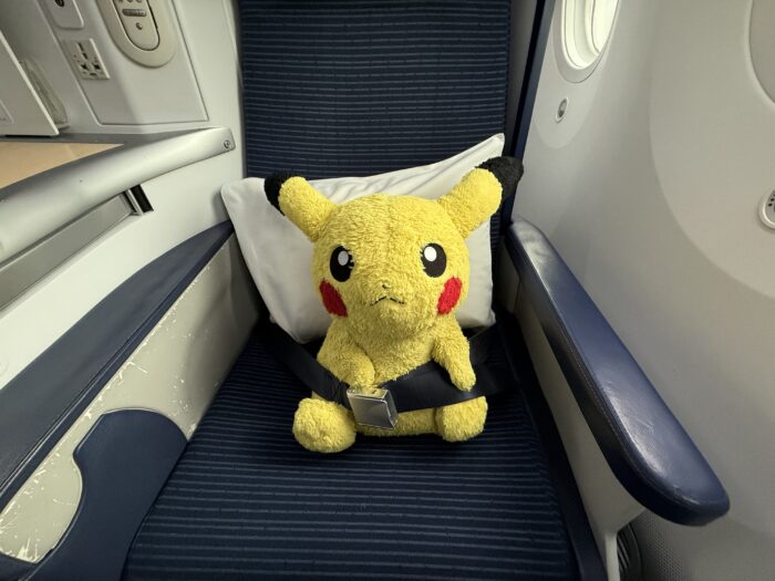 CAさんがピカチュウのぬいぐるみを持ってきてくれたので、座らせてみました。