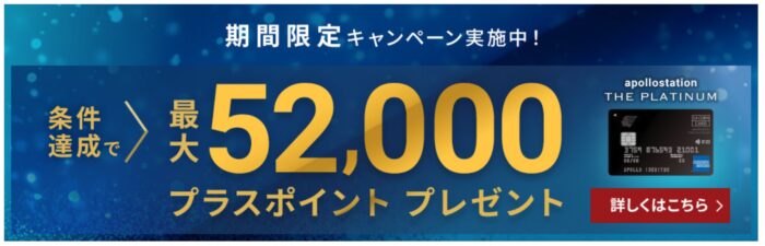 apollostation THE PLATINUMでは、2026年1月20日〜3月31日までに新規のカード申し込みをして発行をすると最大52,000ポイントを獲得できるキャンペーンを開催しています。