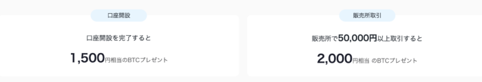 ②口座開設30日以内に販売所で5万円以上の取引を行うと2,000円相当のビットコイン獲得