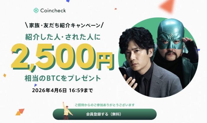コインチェックでは、現在紹介コードを使った口座開設+暗号資産の購入で最大2,500円相当のビットコインを獲得することができます。