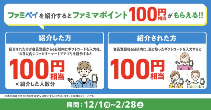これからファミペイを利用する場合は、紹介コードを利用することによって合計200円のファミマポイントを得ることができます。