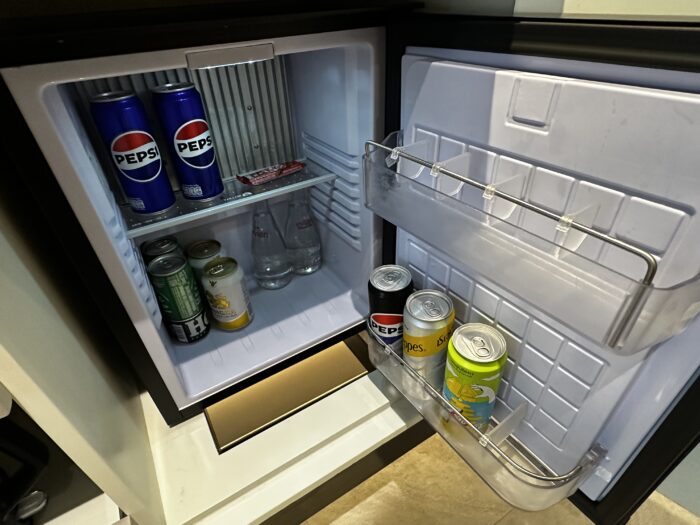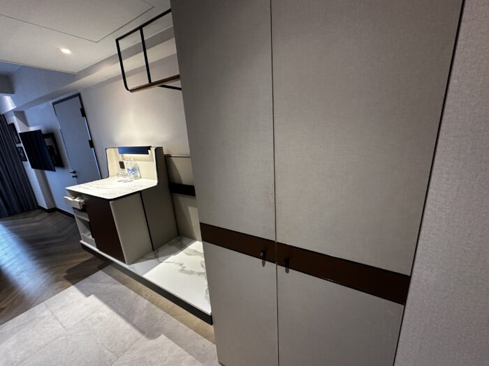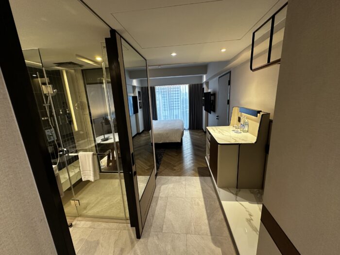 部屋に入ると、左側にバスルーム、右側に荷物置き場とミニバーがあり、奥側がベッドルームになっています。