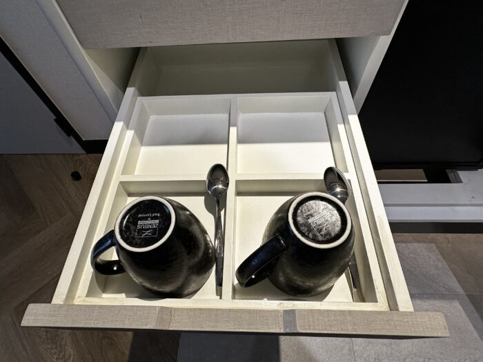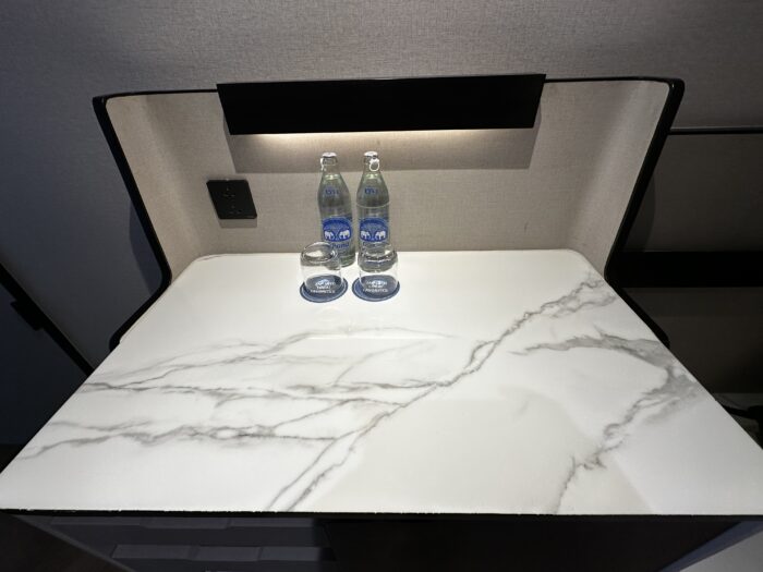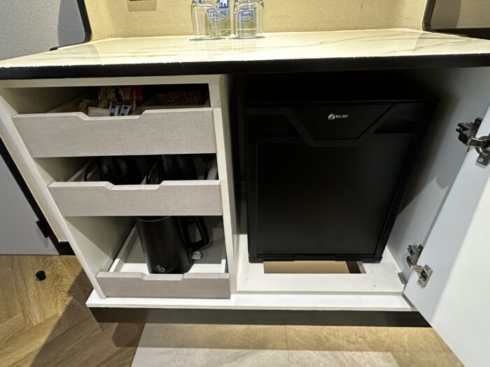 ミニバーの台の上には水のボトルが2本とグラスがあります。