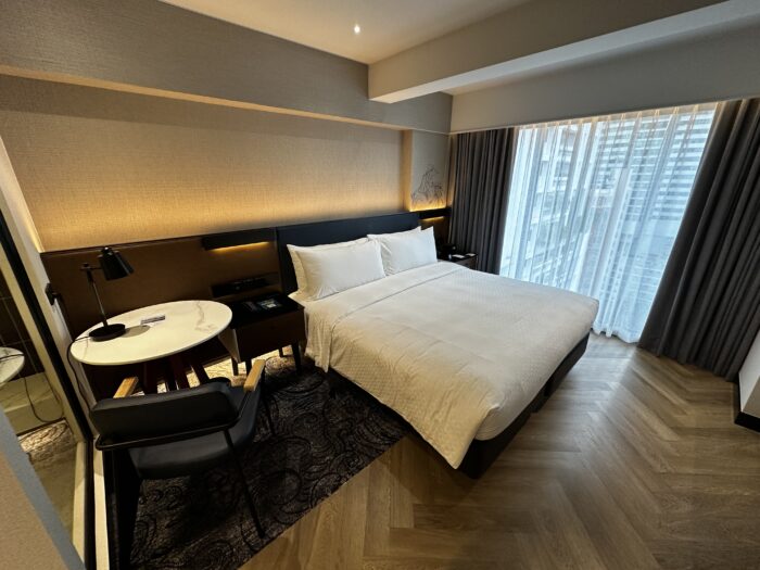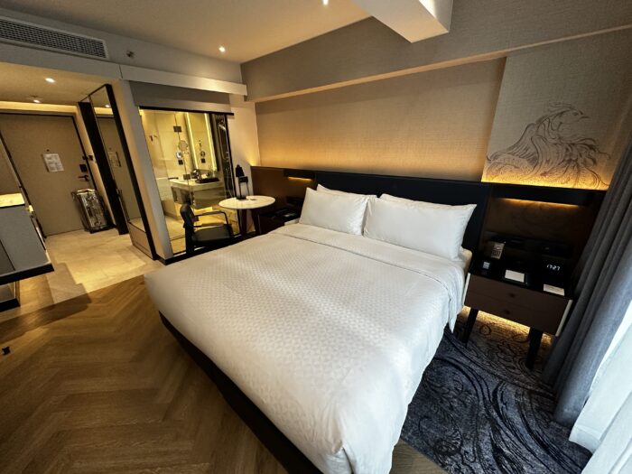 部屋の広さは22㎡で、キングベッドと手前側にはテーブルセットがあります。