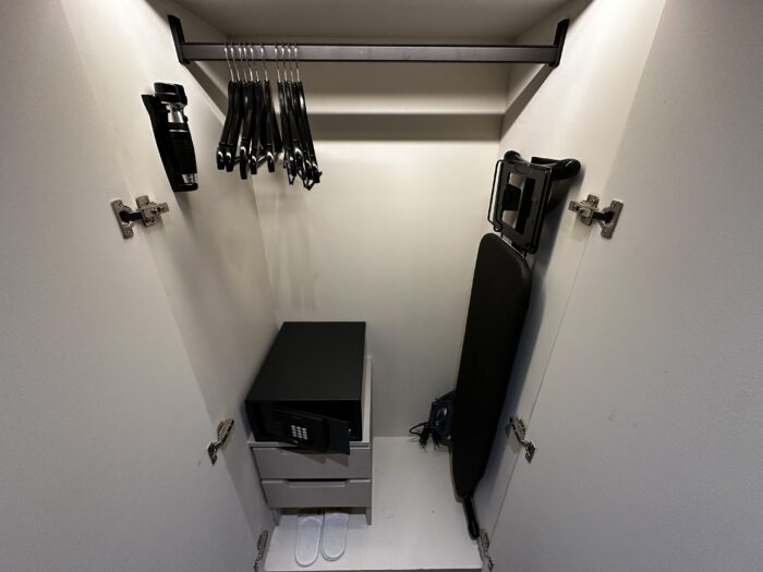 中には、ハンガー、スリッパ、セーフティーボックス、アイロンがありました。