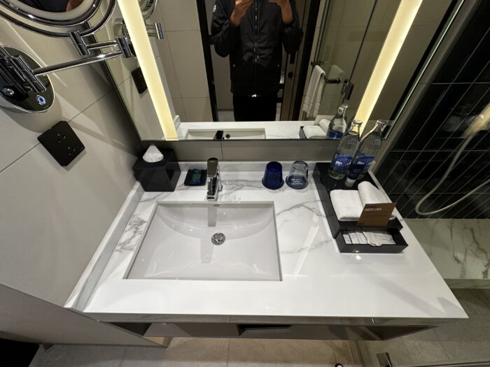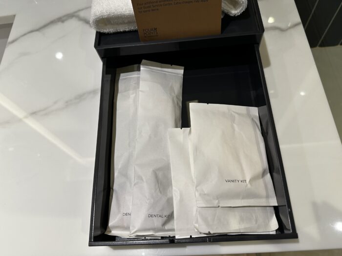 シングルシンクの洗面台に、アメニティセットが置かれています。