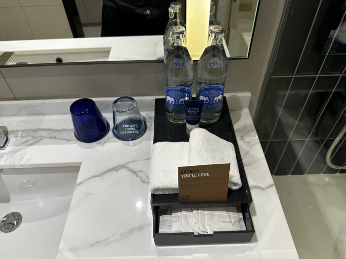 水のボトルとミニタオル、ボディーローションがあって、ケースの中にはアメニティが入っています。