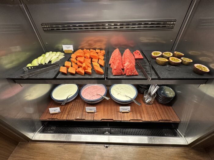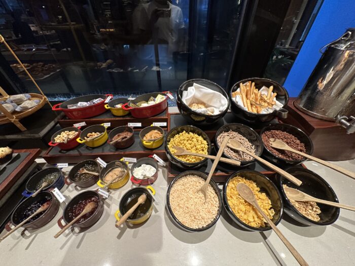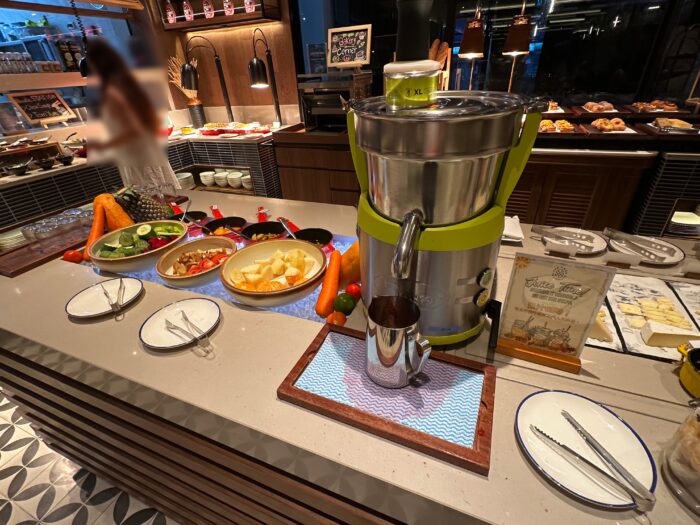 コーンフレーク、ドライフルーツ、右側はフレッシュジュースを作れるコーナーでした。