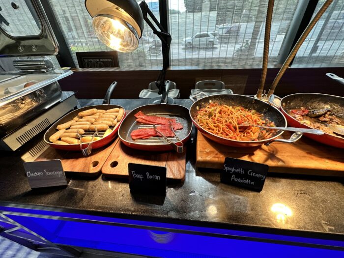 ホットミールは、牛肉の胡椒炒め、グリルトマト、カレー味のポテト、チキンソーセージ、ビーフベーコン、スパゲッティ アラビアータ。