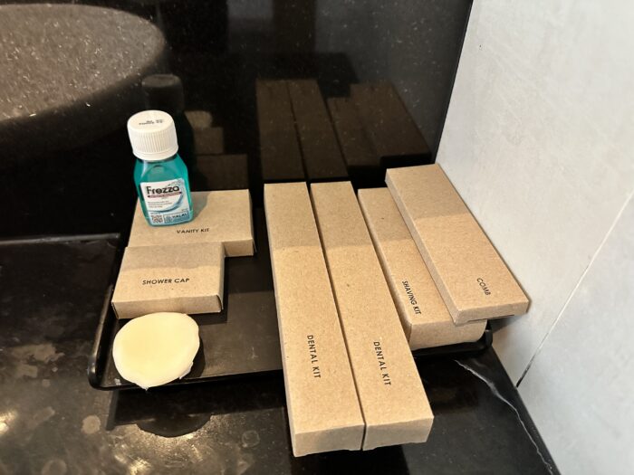 アメニティは、歯ブラシ、シェービングセット、クシ、シャワーキャップ、マウスウォッシュなど。