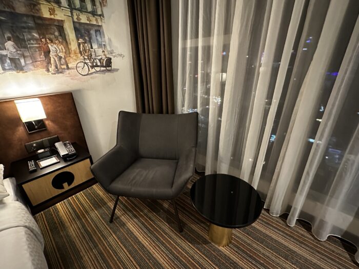 窓側にはミニテーブルとチェアがあり、チャイナタウンの風景が描かれた絵が飾ってあります。