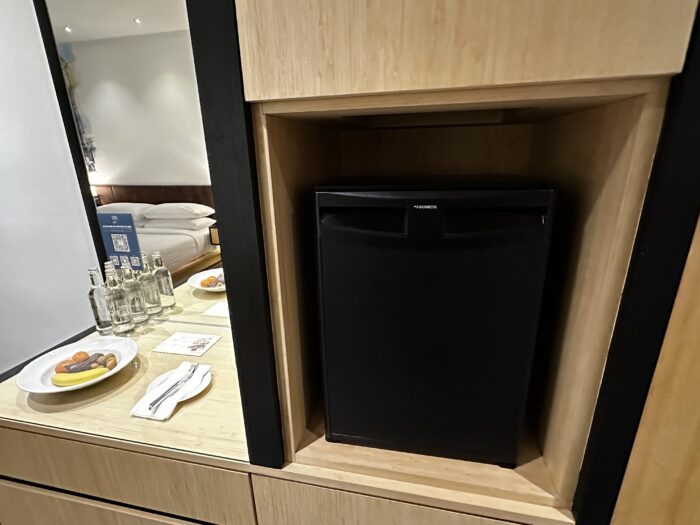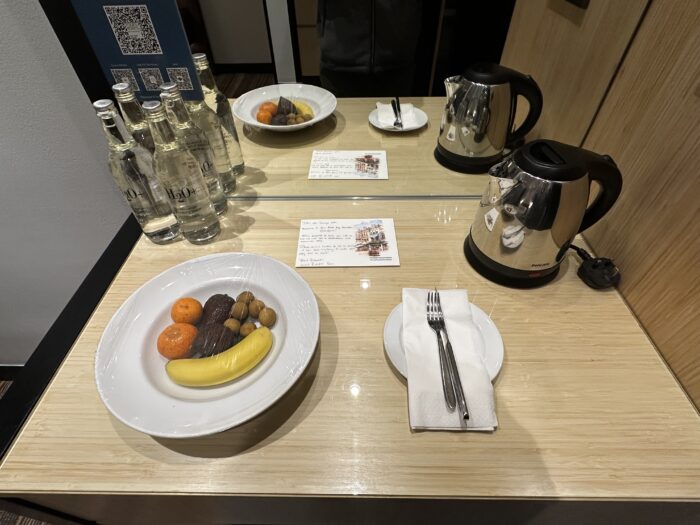 ミニバーには、ウエルカムギフトのフルーツに水のボトルが4本と電気ケトル。