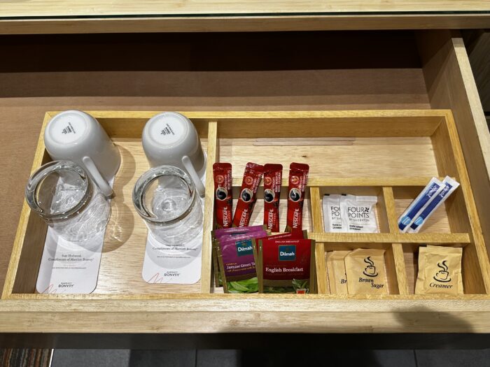 引き出し内にはティーバッグ(イングリッシュブレックファースト、ジャスミン)、インスタントコーヒーとグラス、コーヒーカップが入ってます。