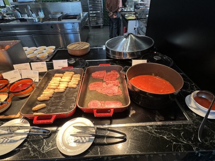 ベイクドビーンズ、ビーフブリスケット、チキンソーセージ、右側はマレー料理コーナーでナシレマ、ミーゴレン、カムヒョンチキン、タフサンバルがありました。