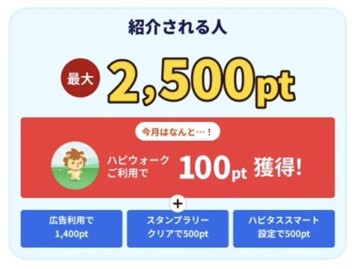 ハピタスへ新規加入をする際、既存の会員より紹介を受けて登録すると最大2,600ポイントを獲得することができます。