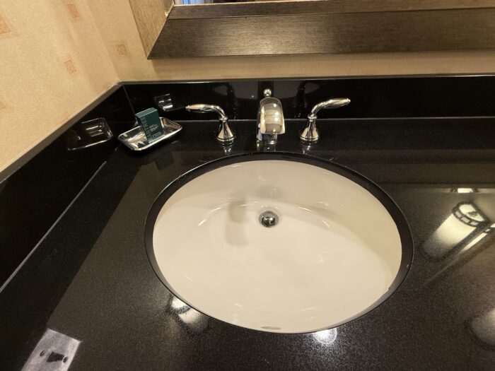 シングルシンクで、アメニティは石鹸とボディローションのみです。