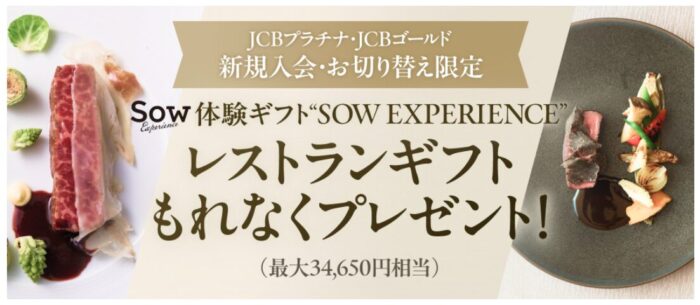 2026年4月1日(水)~の間に、JCBプラチナへの新規入会、または切り替えをし、対象期間中に利用金額を達成するとSOW EXPERIENCEで利用できる34,650円相当のレストランギフトを獲得することができます。