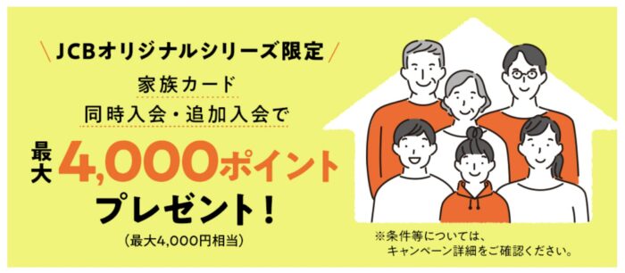 キャンペーンの受け取りには、JCBオリジナルシリーズに家族カードと同時に申し込み、またはすでにお持ちの方は家族カードを追加申し込みし、追加した家族カードでキャンペーン参加登録&カードを1回以上利用することが条件になります。
