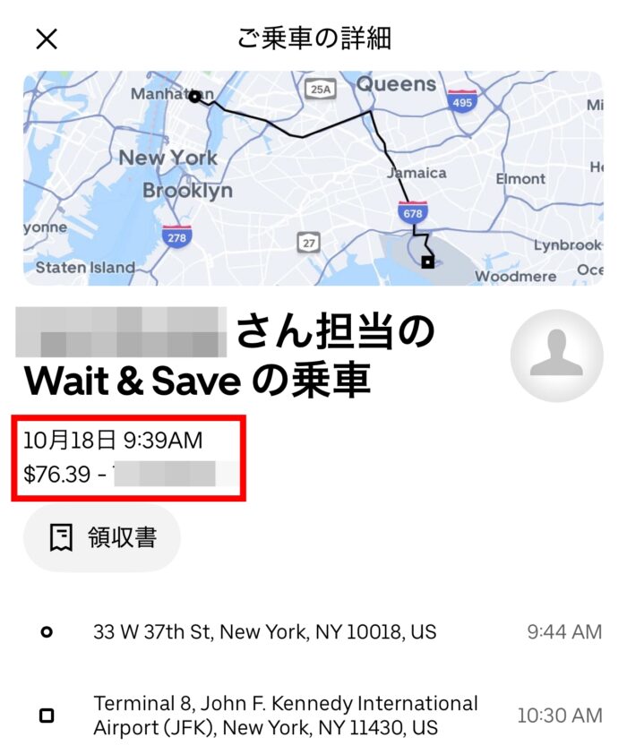空港(JFK、EWR)からはUberで70〜90ドルくらいです。(混雑している時間は120〜140ドル程度)