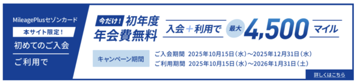 マイレージプラスセゾンカードは、4,500マイル獲得できるキャンペーンを開催中です。