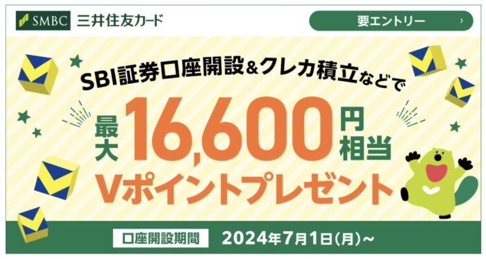 SBI証券の口座開設、積み立てを行うと、最大で16,600円相当のVポイントを獲得することができます。