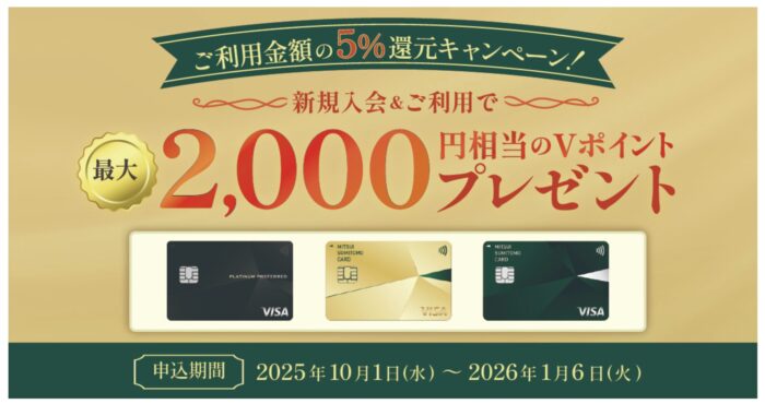 2026年1月6日までにカードに入会した場合、入会後1ヶ月後末まで利用金額の5%がVポイントとして付与されます。