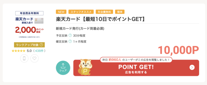 楽天カードをお持ちでない場合は、モッピーから発行をオススメしたいと思います。