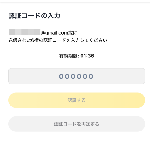登録したメールアドレスに、認証コードが届きますので、コードを入力して「認証する」をタップします。