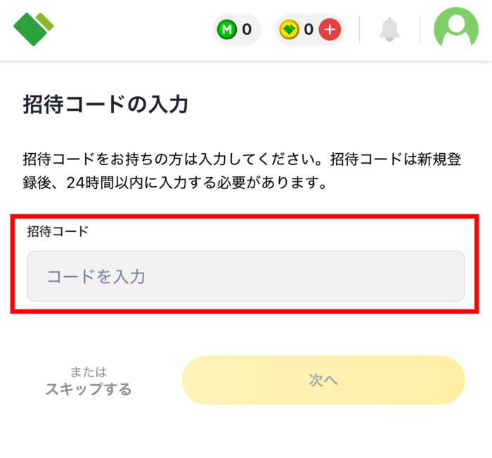 先ほども少し触れましたが、登録の勢いで招待コードの入力を飛ばしてしまった場合でも、会員登録から24時間以内であれば後から入力することが可能です。