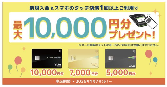 2026年3月1日までの期間でスマホタッチ決済をした金額の20%がVポイントPayギフトとして付与されます。