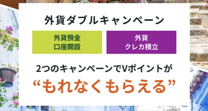 ①外貨預金口座開設キャンペーン:200米ドル相当額以上の預入で、もれなくVポイント3,000円相当がもらえる