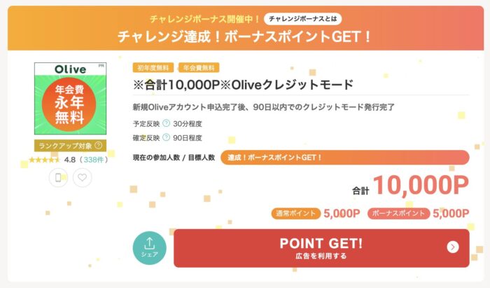 現在、モッピーではOliveの発行で10,000ポイント獲得(10,000円相当)のキャンペーンを開催しています。