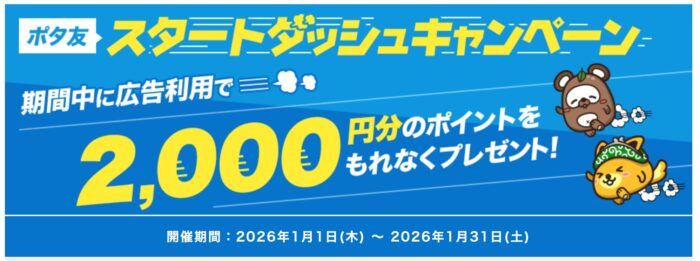 - ポタ友スタートダッシュキャンペーン最大20,000pt(2,000円)
