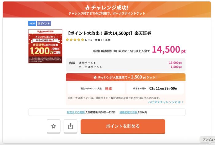 獲得ポイントはハピタスで上記の通り14,500ptとなっています。