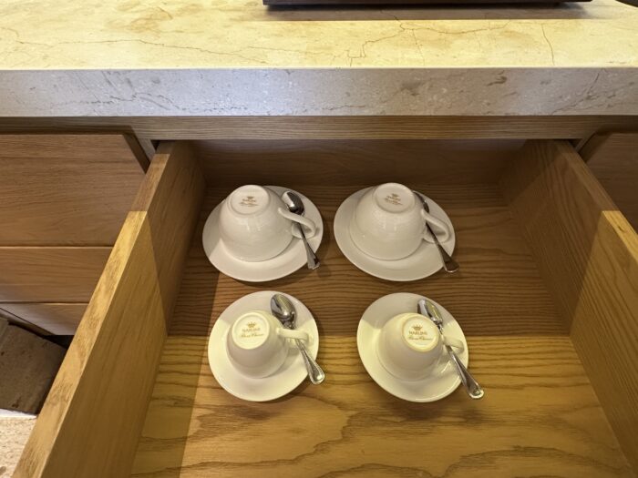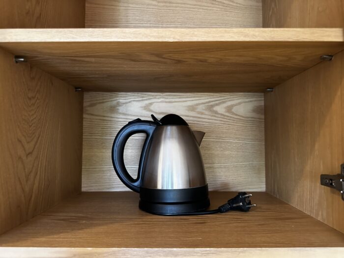 流ししたの引き出しにはコーヒーカップ、電気ケトルがあります。