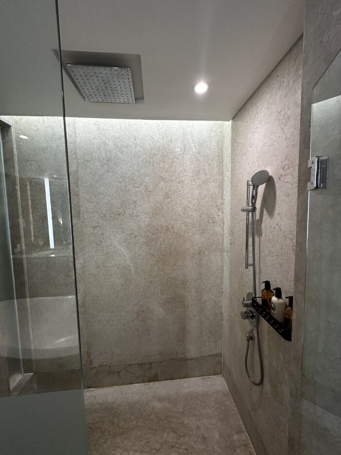 シャワールームは、レインシャワーとホースシャワーの2タイプ。