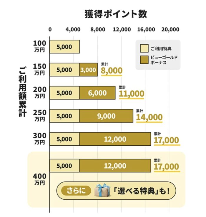 また、年間の利用金額に応じてボーナスポイントがもらえるビューゴールドボーナスがあるので、年会費以上の価値を得やすいカードにもなっています。