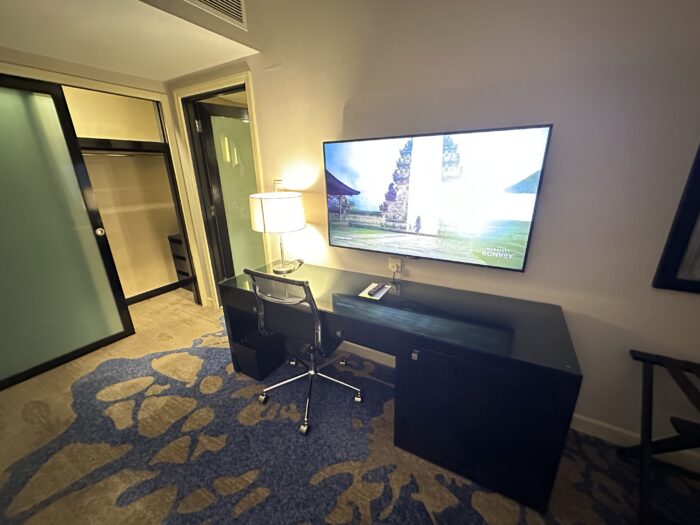 ベッドルームにもデスクが用意されており、テレビは壁掛けで55インチくらいの大型のものが設置されています。