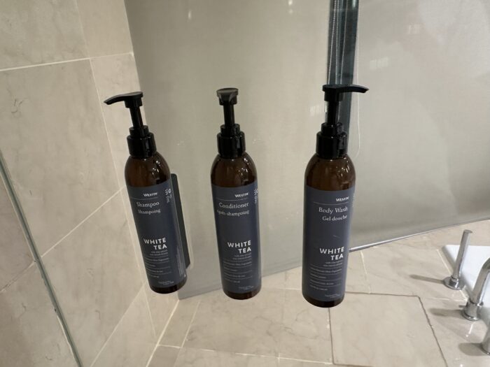 ボディソープ、シャンプーはウェスティンホテル共通の「WHITE TEA」のボトルが設置されてました。