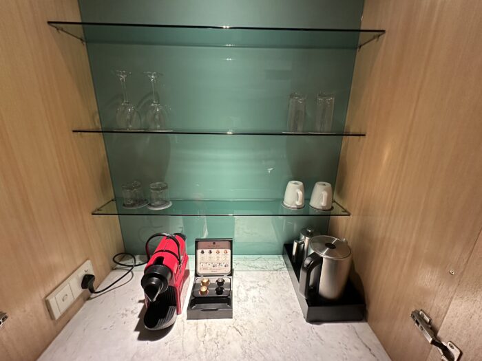 ネスプレッソのコーヒーマシン、アイスペール、電気ケトルがあります。