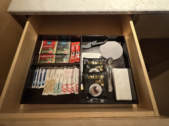 引き出し内には、ドリップのコーヒー、紅茶はイングリッシュブレックファーストとアールグレイ2種類のティーバッグがありました。