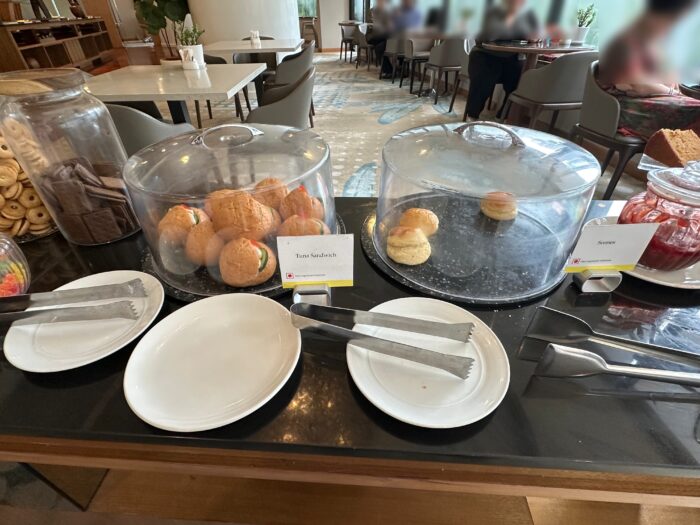 ツナサンドイッチ、スコーン、ジャム、チョコレート、ビスケットなど