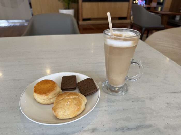 コーヒーはスタッフが注文を取りにきてくれたので、ホットカフェラテを頼んでます。