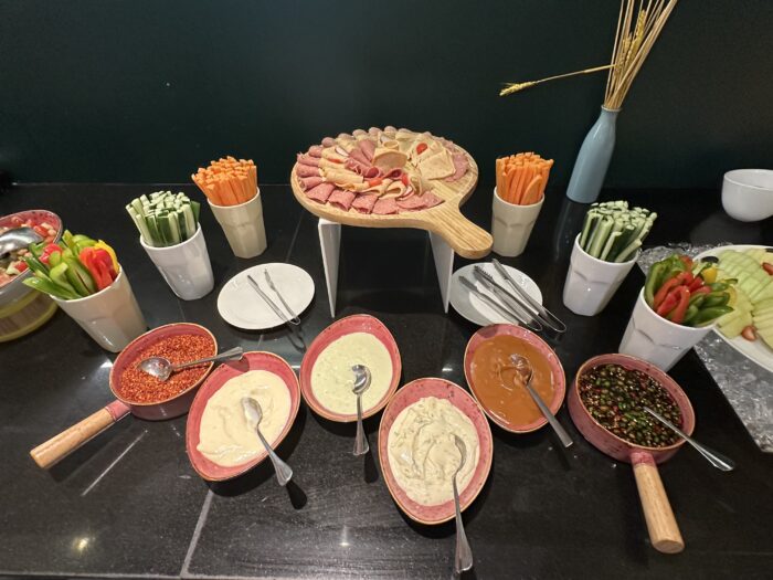 ハムの盛り合わせ、野菜スティックとディップソースが一式、シーフードヌードルサラダ、ポテトサラダ、ひよこ豆のサラダ